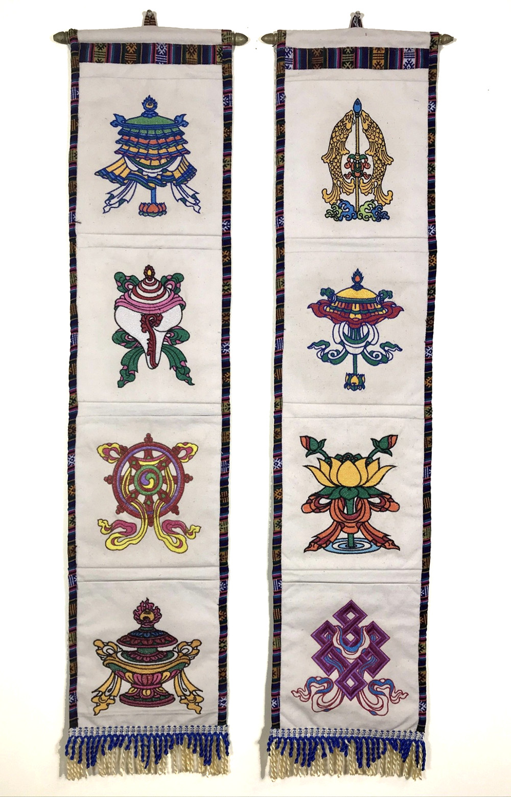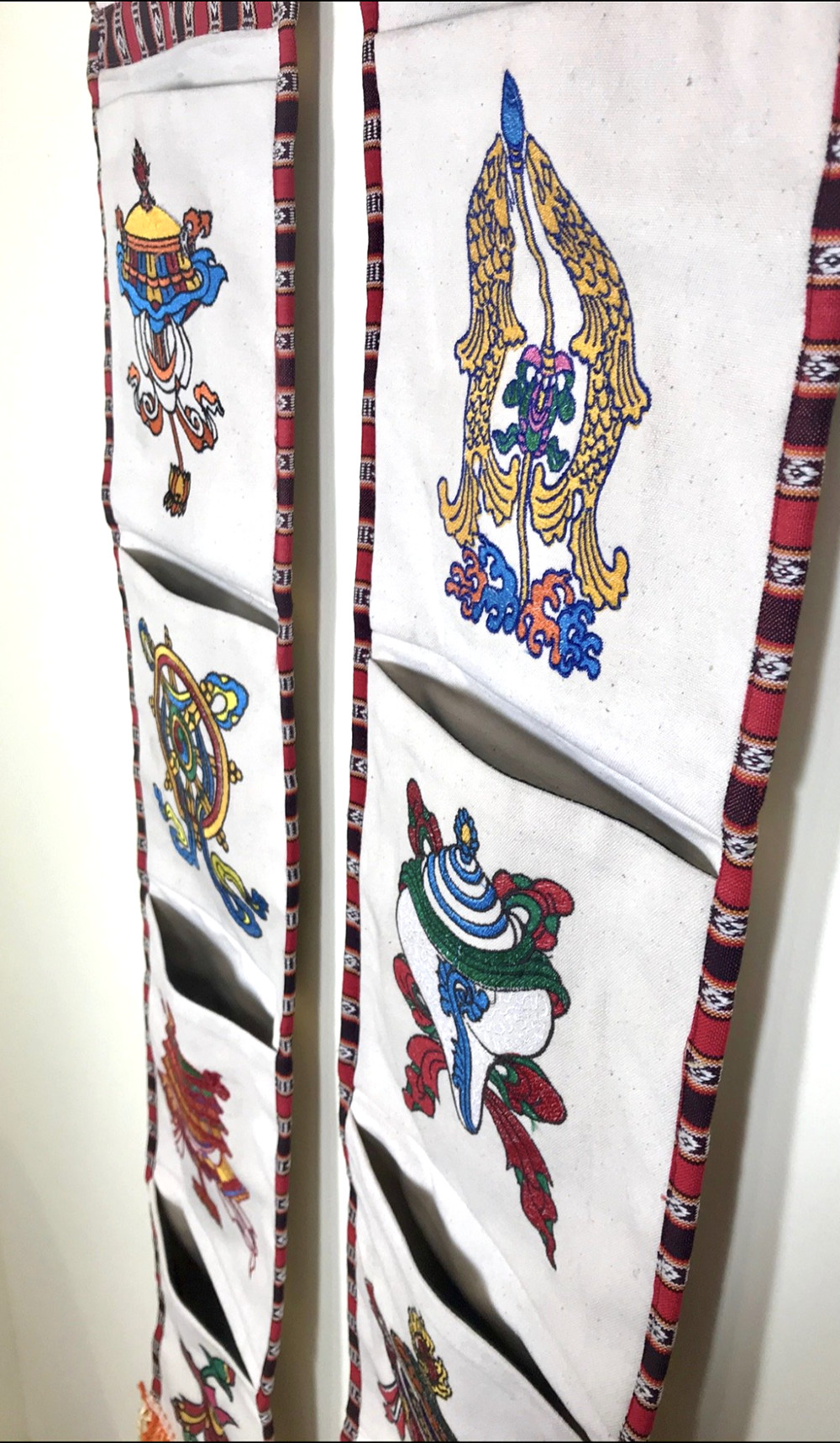 Heavy cotton fabric with embroidered auspicious symbols; each banner has four pockets.