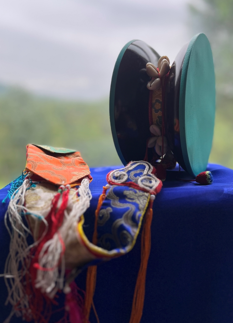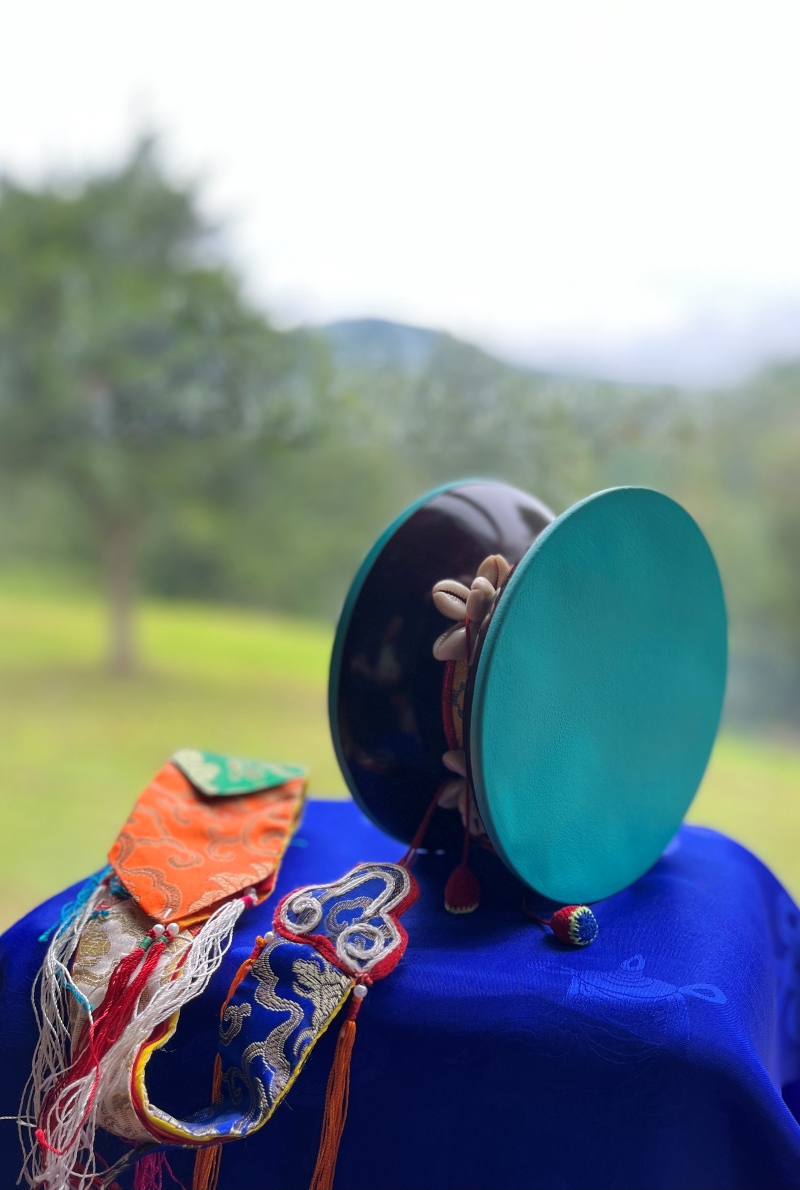 Chöd Drum measuring 7 inches in diameter, skin dyed with herbs and minerals, with brocade case.