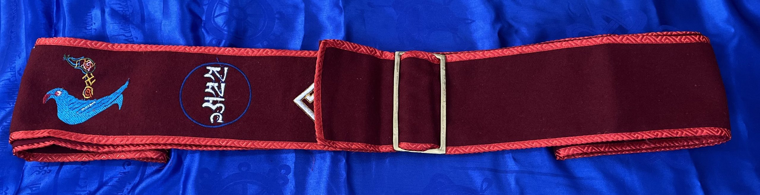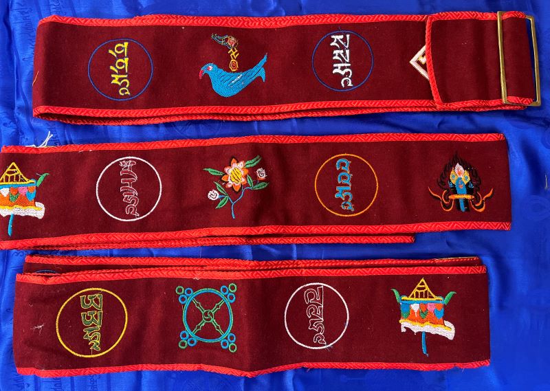 86″ long and 4″ wide, magnificent handmade maroon wool, decorated with a red cotton lining, embroidered with the symbol of Four Directions and Seed Syllables of the Six Dakinis of Mother Tantra.