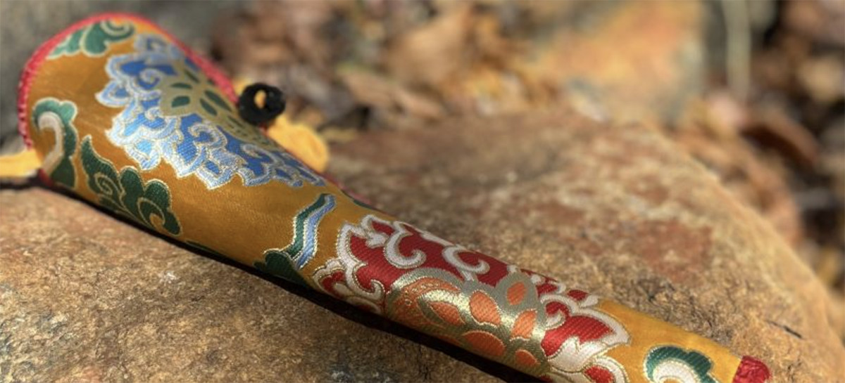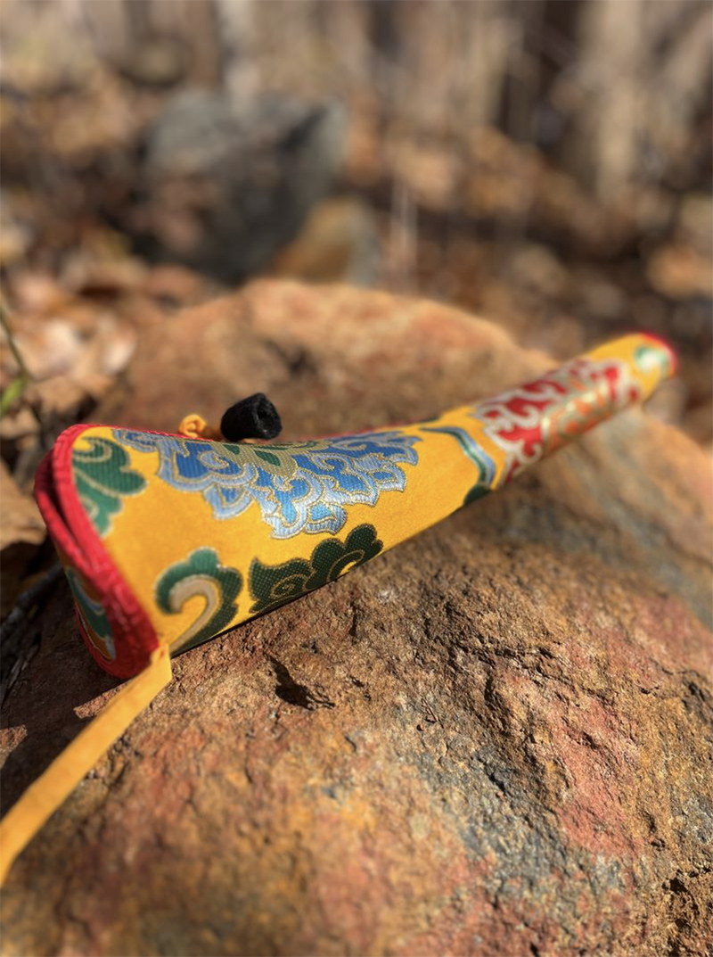 Kangling “trumpet” made of Acacia wood and stunning mixed yellow brocade.