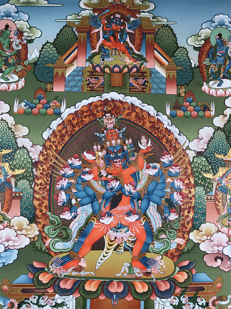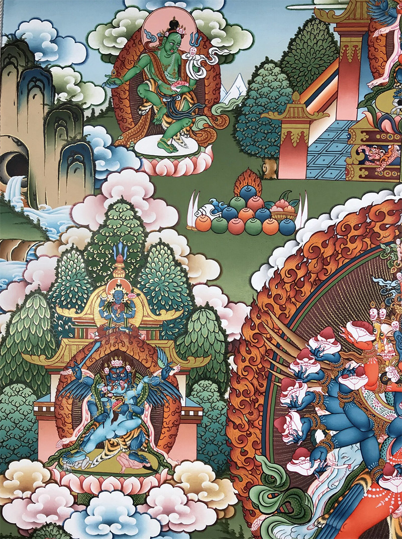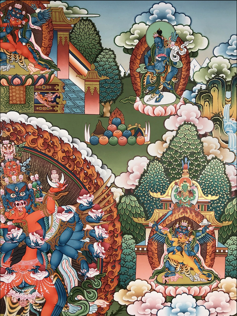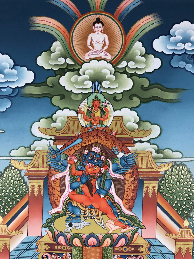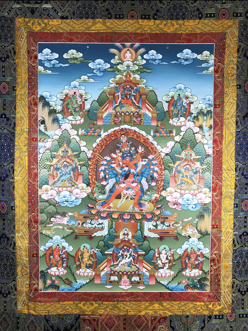 The Ma Gyu, or Mother Tantra, is an essential cycle of Bon teachings taught by Tenzin Wangyal Rinpoche. Depicted in the center of this exquisitely detailed thangka are the principal deities of the Mother Tantra, Sangchok Tartuk Gyal, and his consort, Chema Odtso.