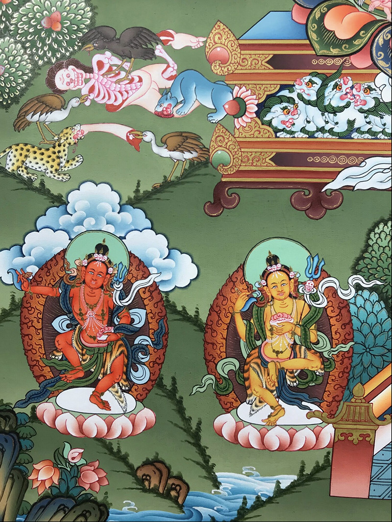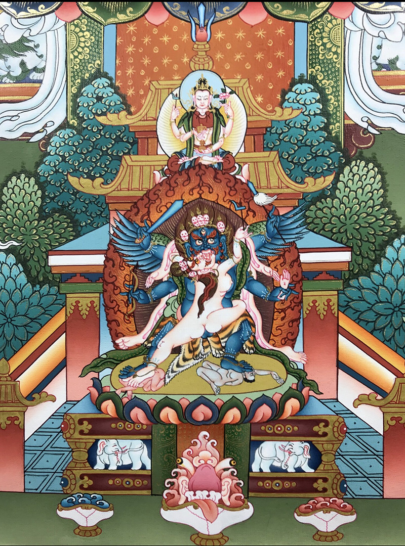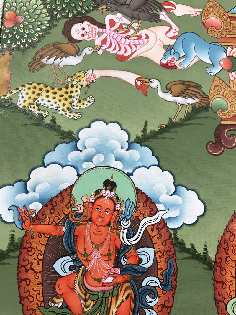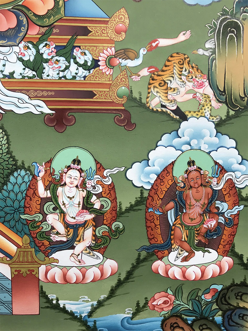 The Ma Gyu, or Mother Tantra, is an essential cycle of Bon teachings taught by Tenzin Wangyal Rinpoche. Depicted in the center of this exquisitely detailed thangka are the principal deities of the Mother Tantra, Sangchok Tartuk Gyal, and his consort, Chema Odtso.