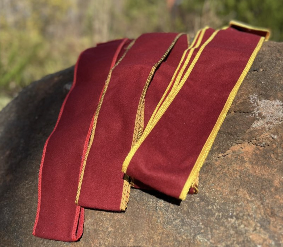 Choose from three different brocade edgings on the rich red wool meditation belt.