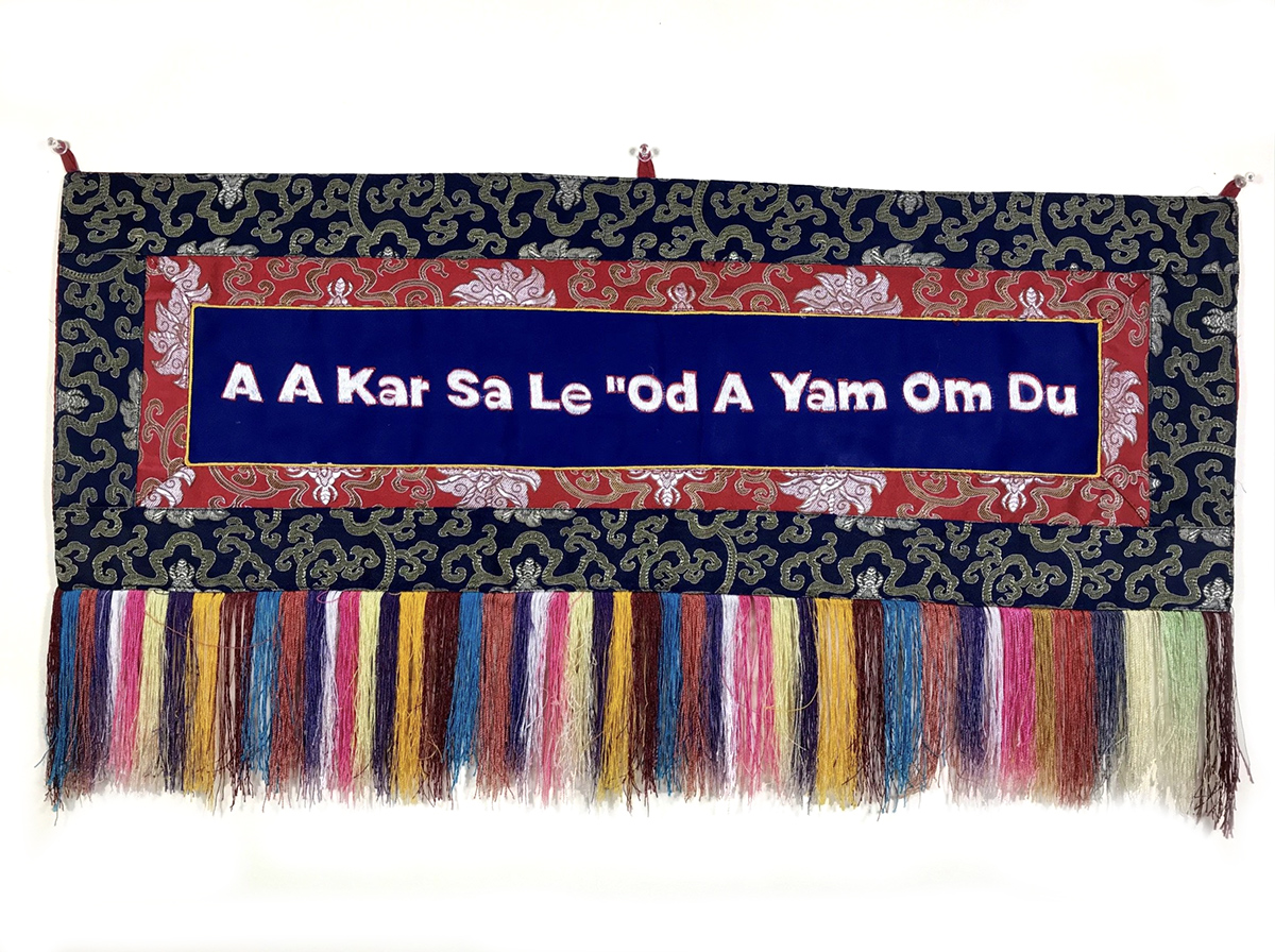 The mantra is embroidered on solid fabric with brocade framing and decorative fringe.