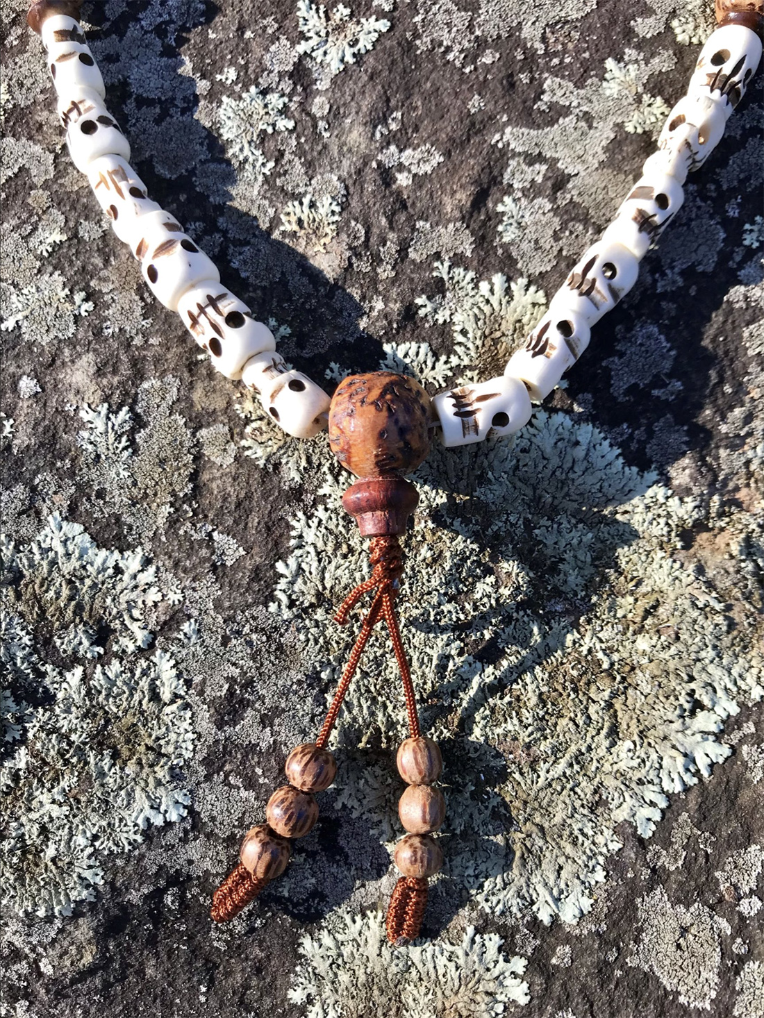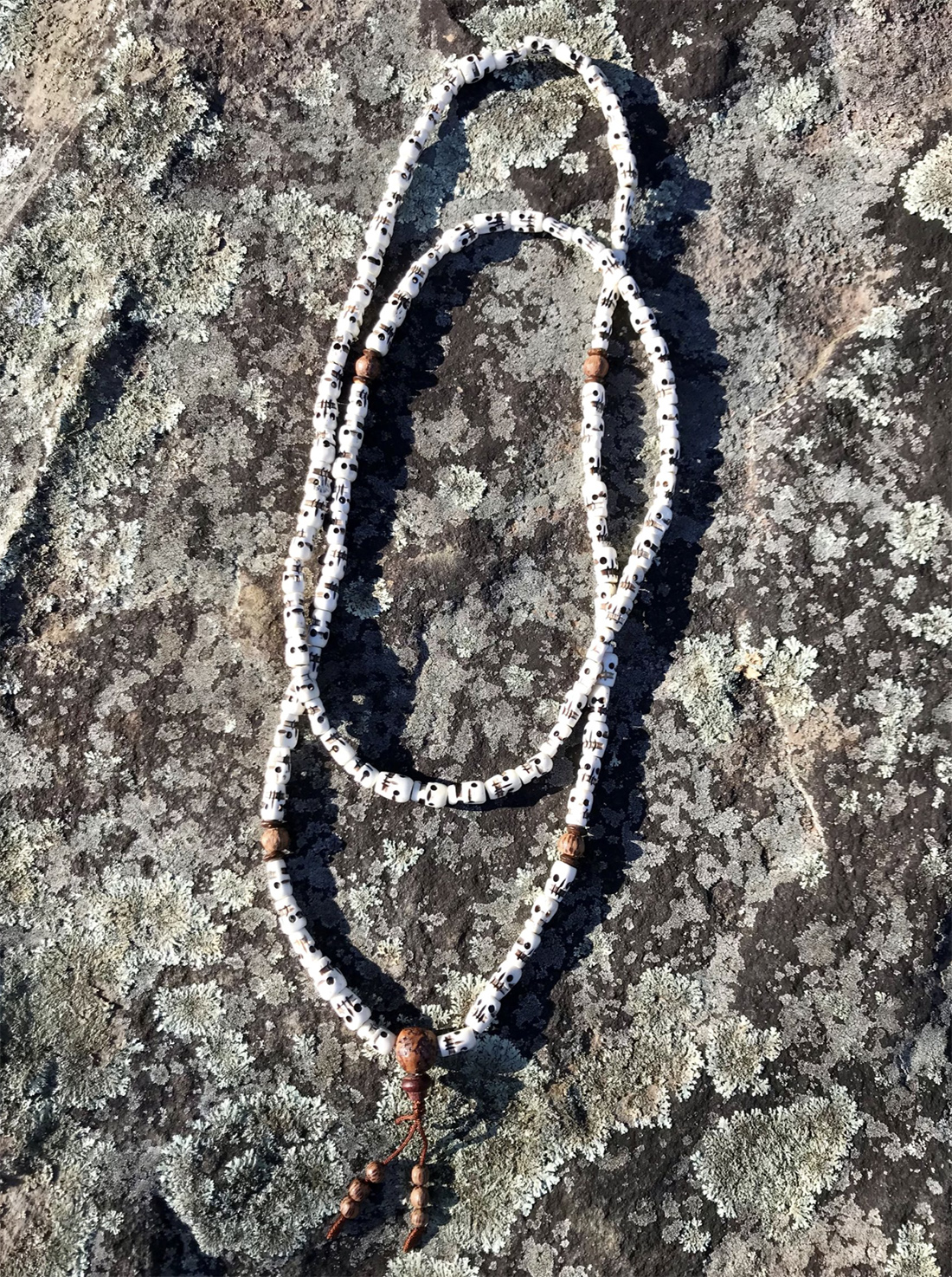 52” long, 108: ½” skull-shaped bone beads with raktu seeds on wire