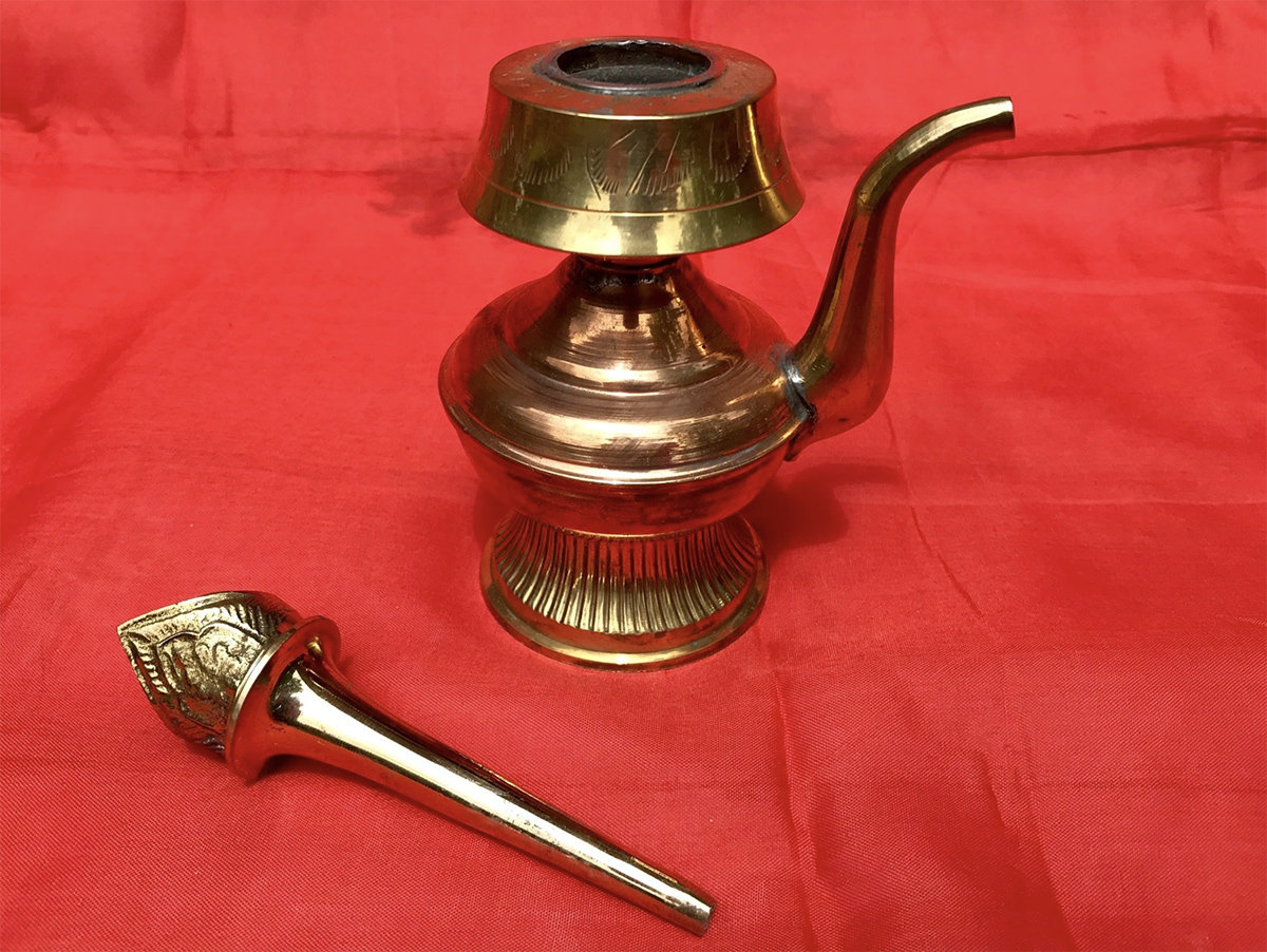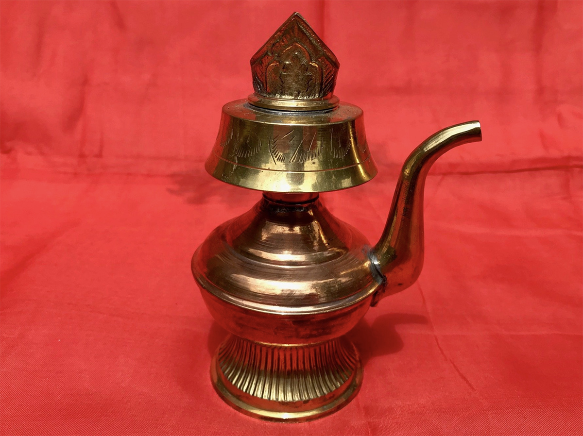 Bhumpa (or spelled bumpa) with spout. There is a top piece where a fan of peacock feathers is placed. The bhumpa is a Tibetan sacred water vase for ritual practices and initiations.