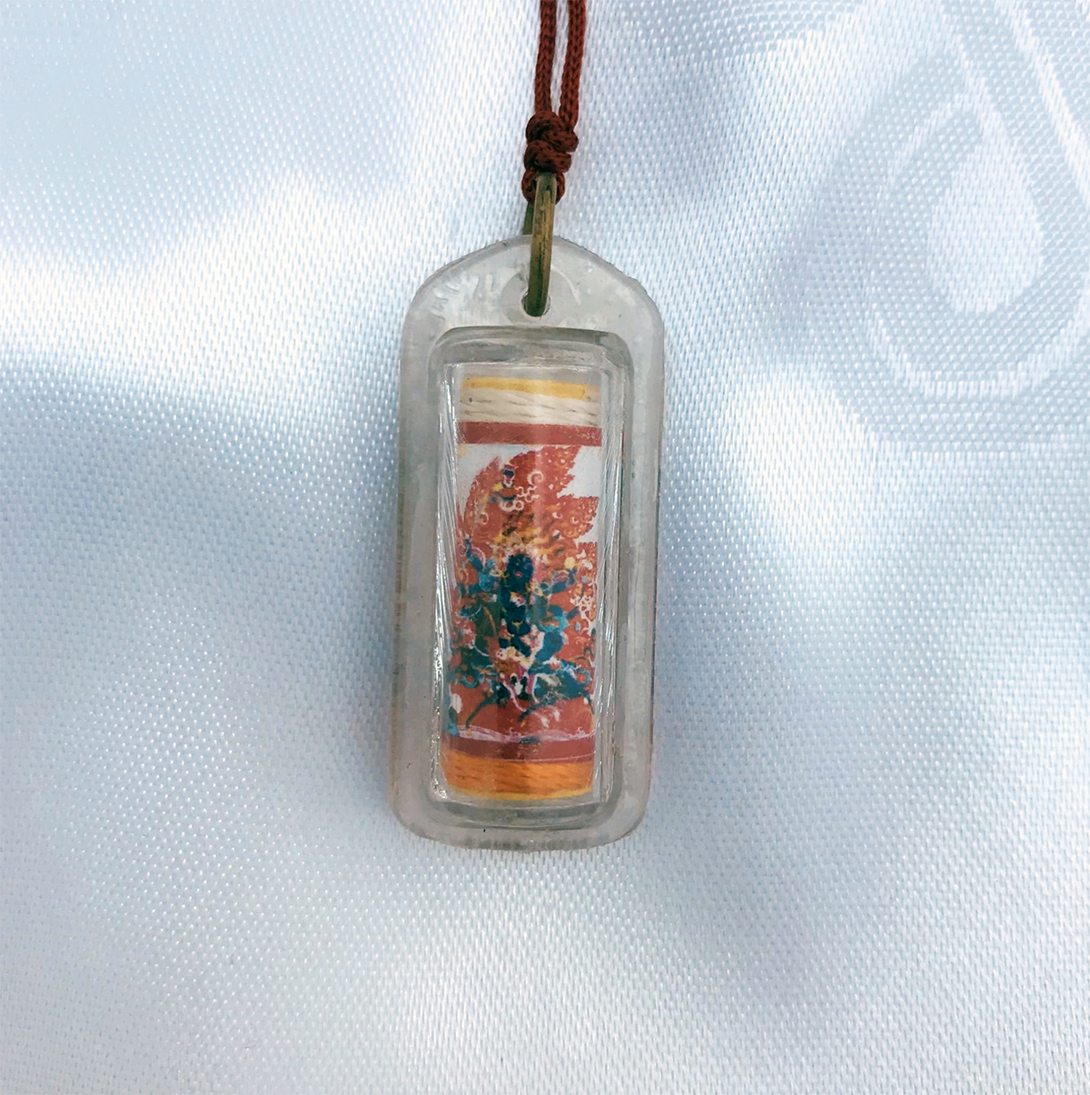 Inside is a piece of paper upon which the particular mandala and mantras are written in Tibetan. The sheet is then folded and wrapped with colored string.These may be worn as a pendant, hung in one’s car or home, or placed on one’s shrine.