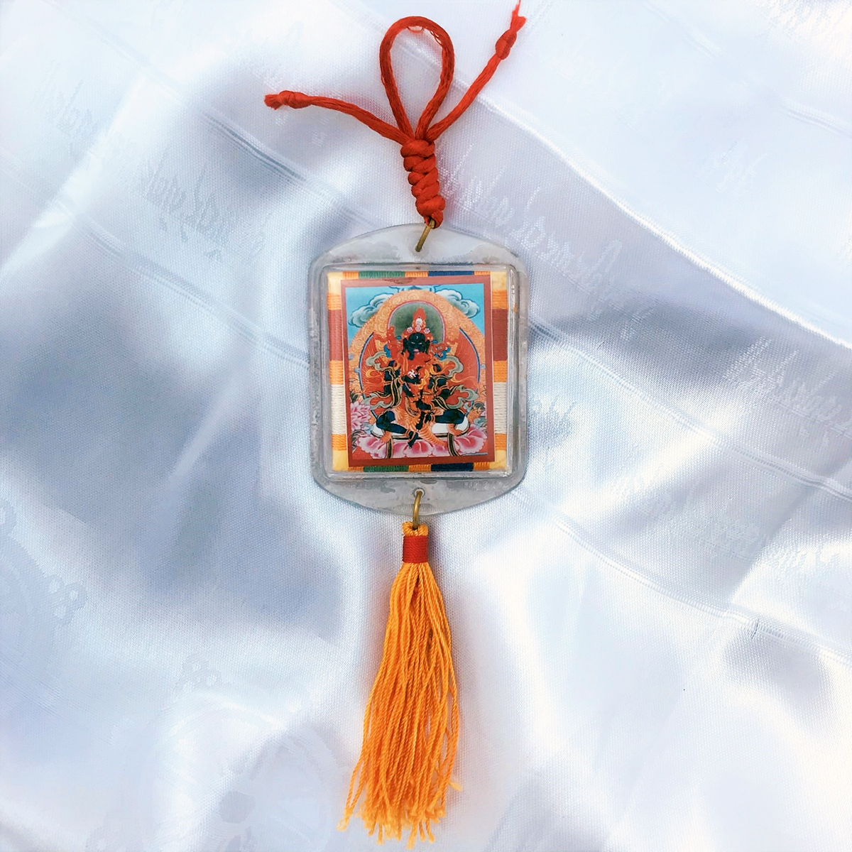 Inside is a piece of paper upon which the particular mandala and mantras are written in Tibetan. The sheet is then folded and wrapped with colored string. These may be worn as a pendant, hung in one’s car or home, or placed on one’s shrine.