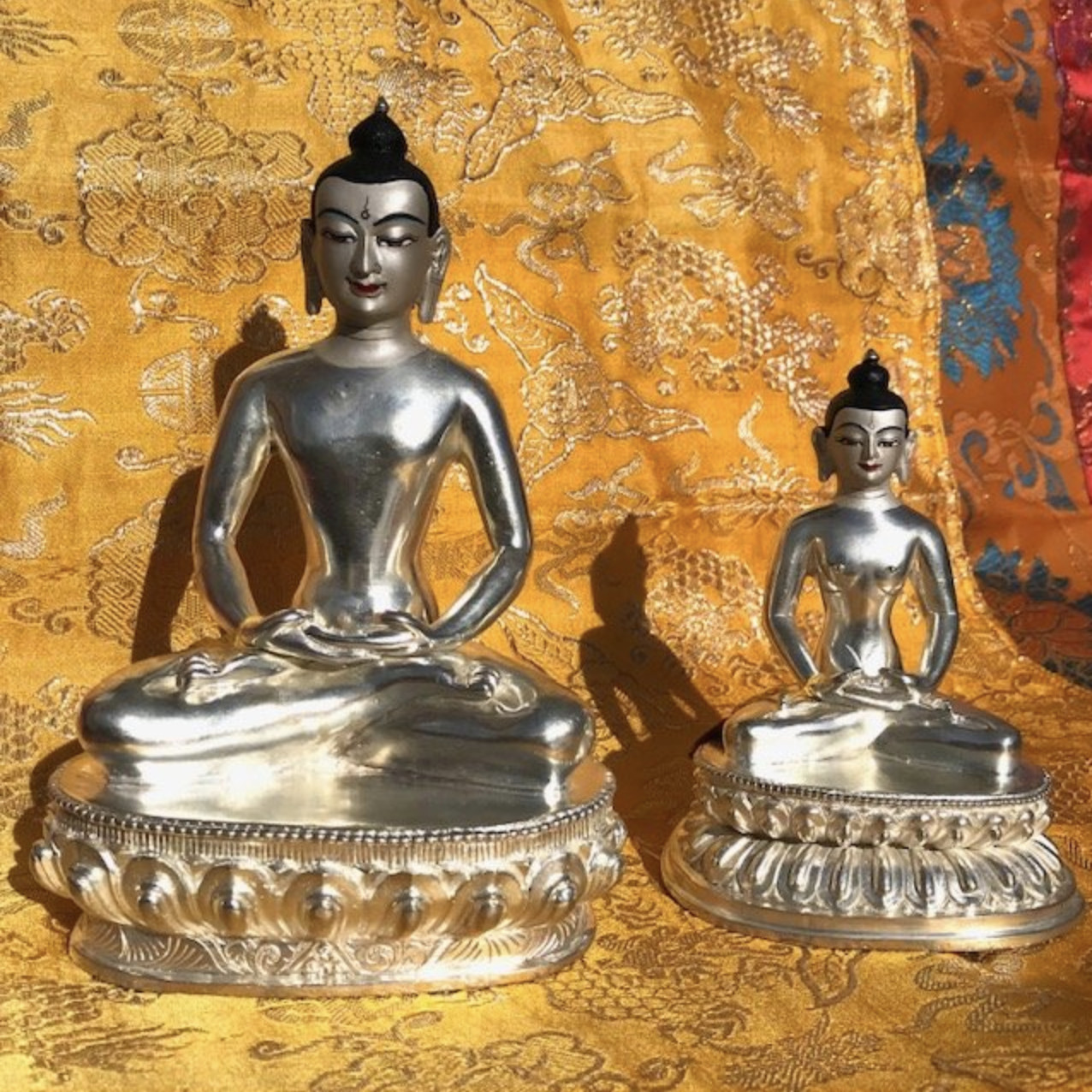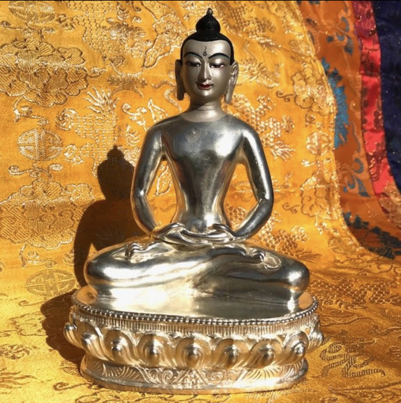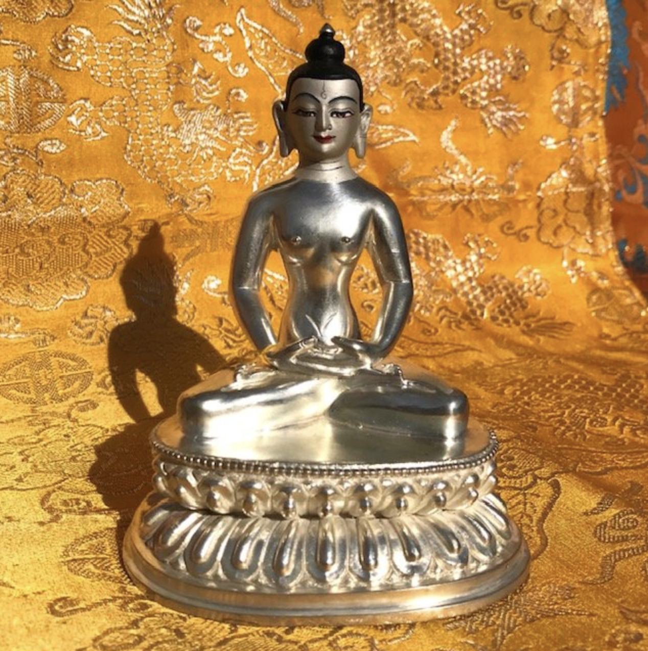 Made of metal with silver dust paint on the face. Handcrafted in Nepal.