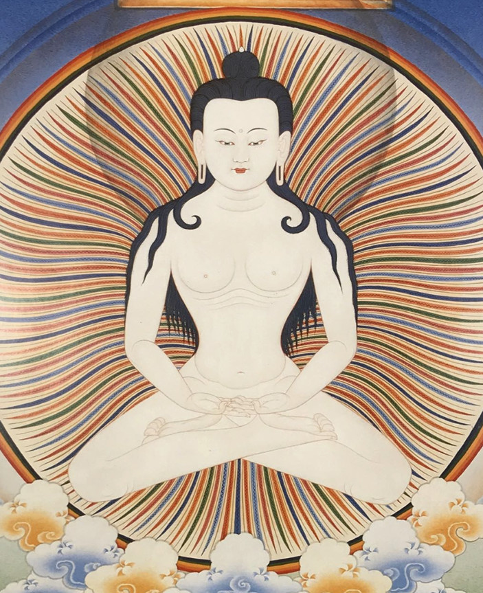 Tapihritsa, born in the seventh to eighth century to a nomadic family in Zhang Zhung (now northwestern Tibet), is considered both a historical figure and an enlightened being who represents the true nature of reality.Tapihritsa was the 25th master in an orally transmitted lineage, known as the Zhang Zhung Nyen Gyü, who transmitted dzogchen pith instructions on the nature of the mind. All these masters attained the rainbow body, or body of light, meaning that the physical body disappeared upon their passing, leaving no trace other than hair and fingernails. After achieving the rainbow body, Tapihritsa later appeared as a young boy to offer guidance and teachings to Nangzher Löpo. He allowed his student to write down the core teachings for the benefit of future generations. Tapihritsa is often held as the central image of refuge in Lamai Naljor, or Guru Yoga.