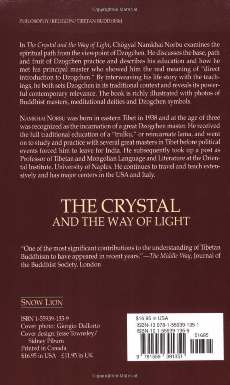 In The Crystal and the Way of Light, Chögyal Namkhai Norbu examines the spiritual path from the viewpoint of Dzogchen. He discusses the base path and fruit of Dzogchen’s practice and describes his education and how he met his principal master, who showed him the real meaning of a direct introduction to Dzogchen. By interweaving his life story with the teachings, he sets Dzogchen in its traditional context and reveals its powerful contemporary relevance. The book is richly illustrated with photos of Buddhist masters, meditational deities, and Dzogchen symbols.