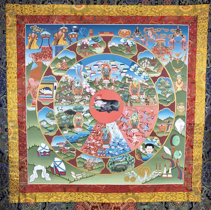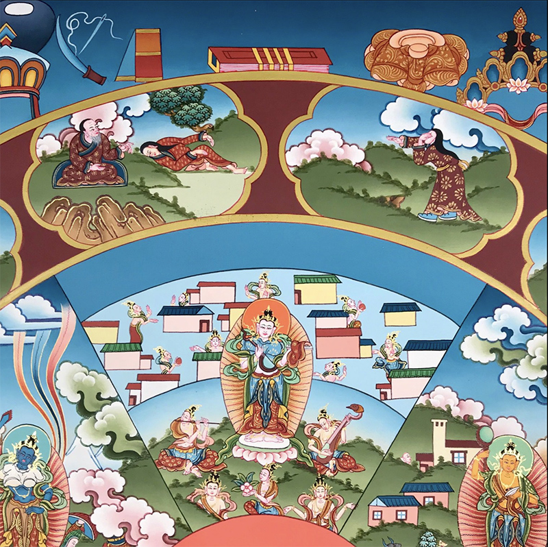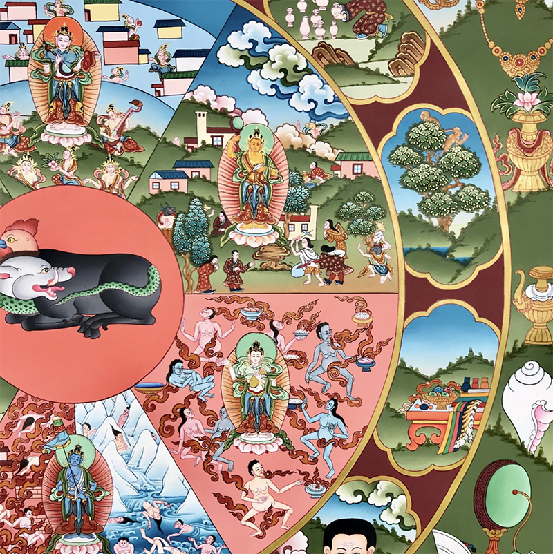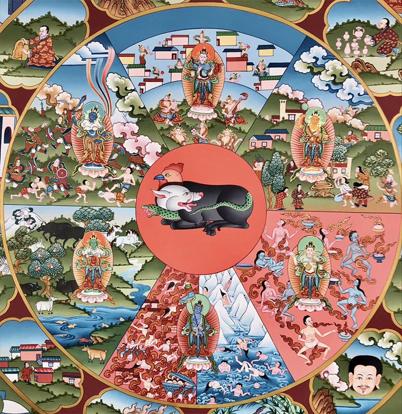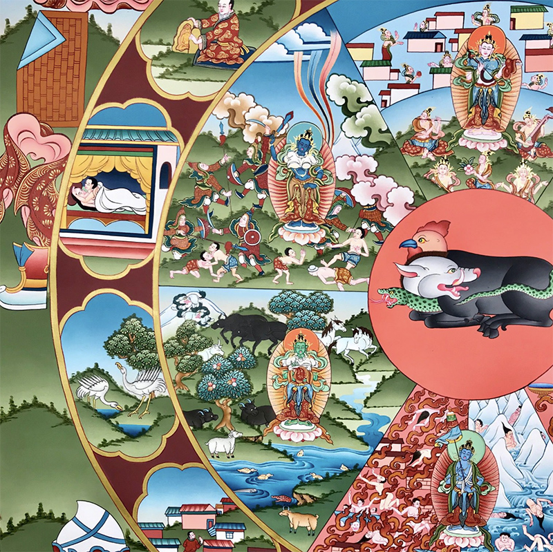 This finely hand-painted thangka of the Wheel of Life is a replica of the painting designed by Yongdzin Tenzin Namdak Rinpoche, which can be seen in the entrance of the main temple at Triten Norbutse Monastery in Kathmandu, Nepal.