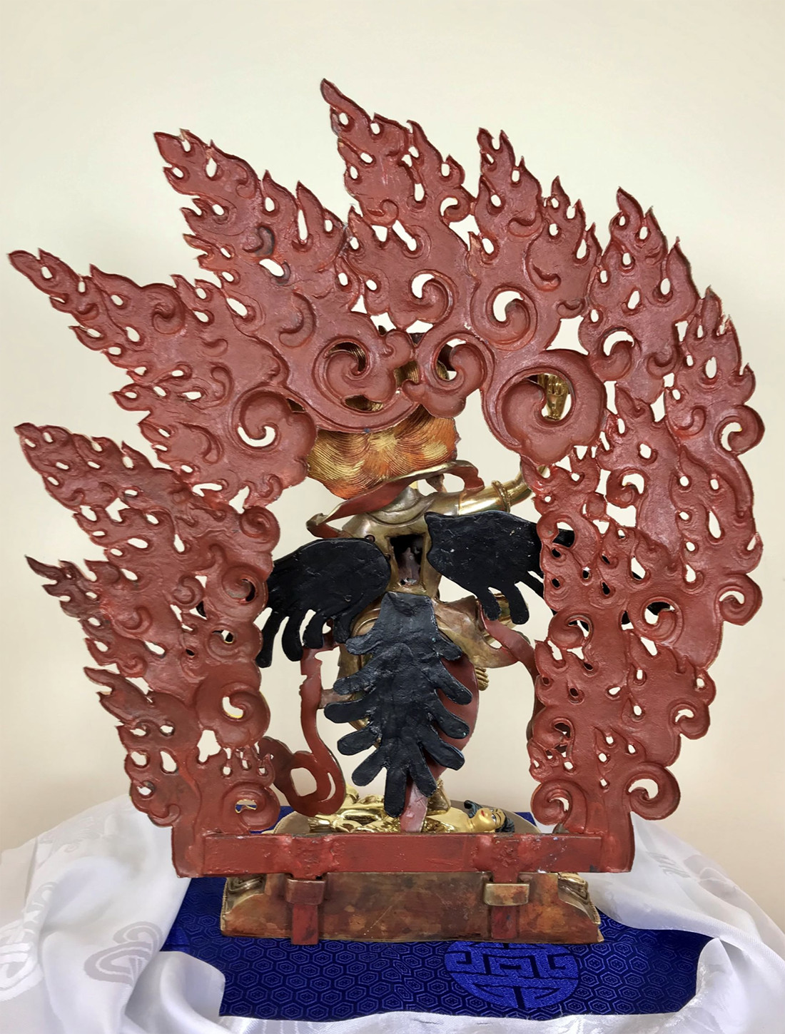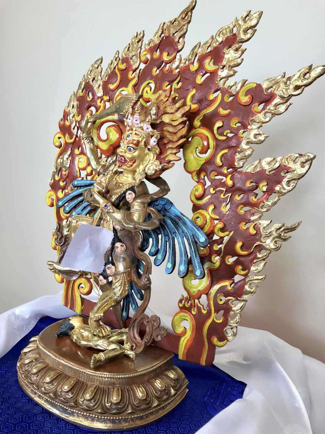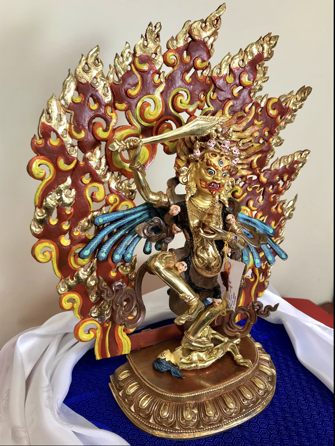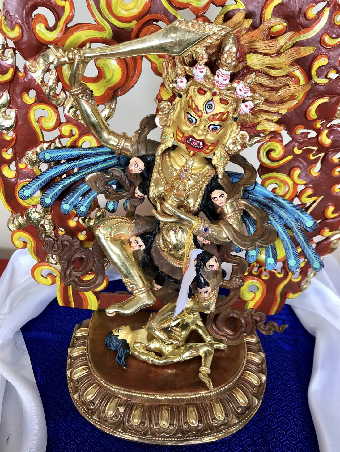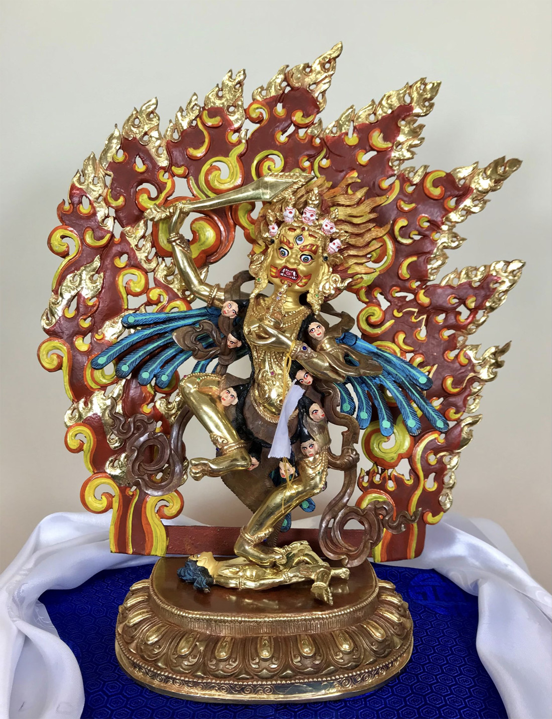 Hand-cast statue made in Nepal. Bronze with gold highlights.